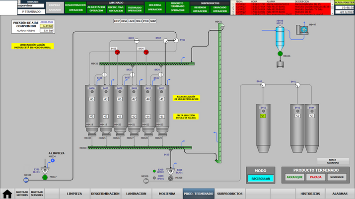 Ingeniería e implementación de la reforma del molino de Trigo con maquinaria BHÜLER. Construcción y armado de tablero de distribución, tableros de arrancadores para 123 motores para Limpieza, Desgerminación, Laminación, Molienda, Producto Terminado y Subproductos. Conexionado eléctrico de 232 aparatos.