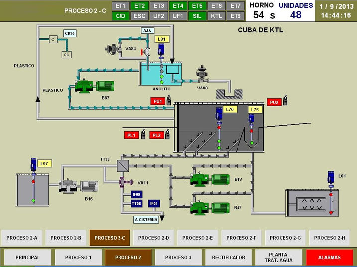 Para mejorar la interfaz con el operador se instaló un Panel View Plus 1500 Keypad/Touch a colores con puerto Ethernet, con lo cual además de tener una representación gráfica del estado de las bombas, válvulas y demás elementos del proceso de pintura por electrodeposición, se logró obtener un listado detallado de todas las alarmas y un registro de ocurrencia de las mismas.